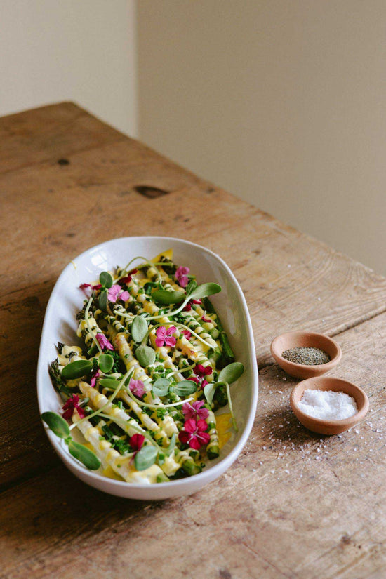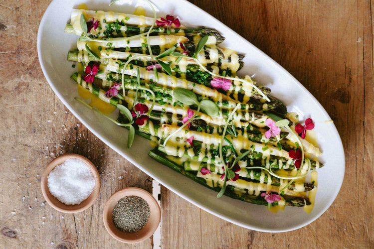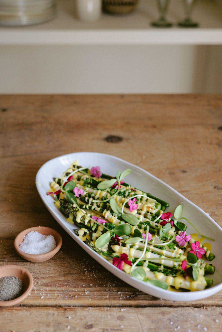 A recipe for a colorful roasted asparagus salad with a hollandaise sauce.